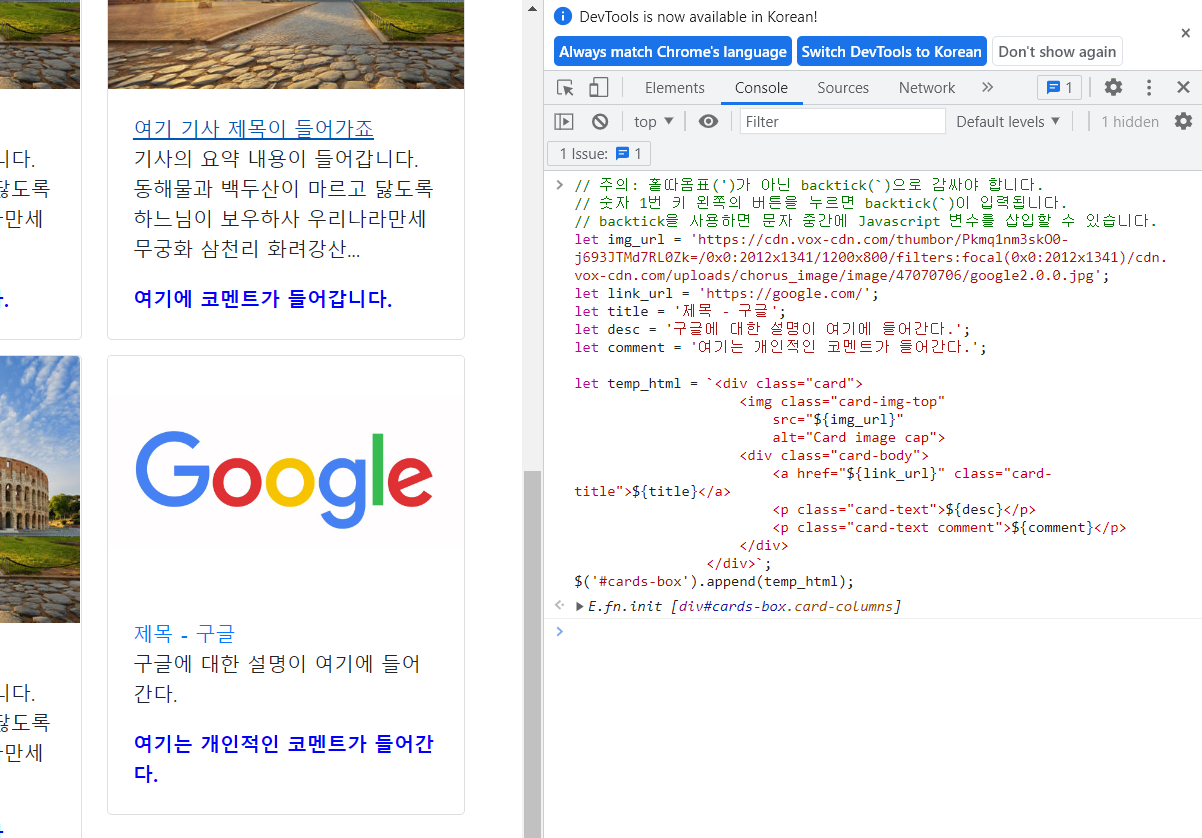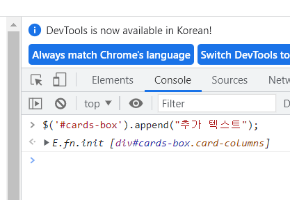 2. 아래 코드를 콘솔창에서 실행하여 카드들 뒤에 텍스트를 넣는다.