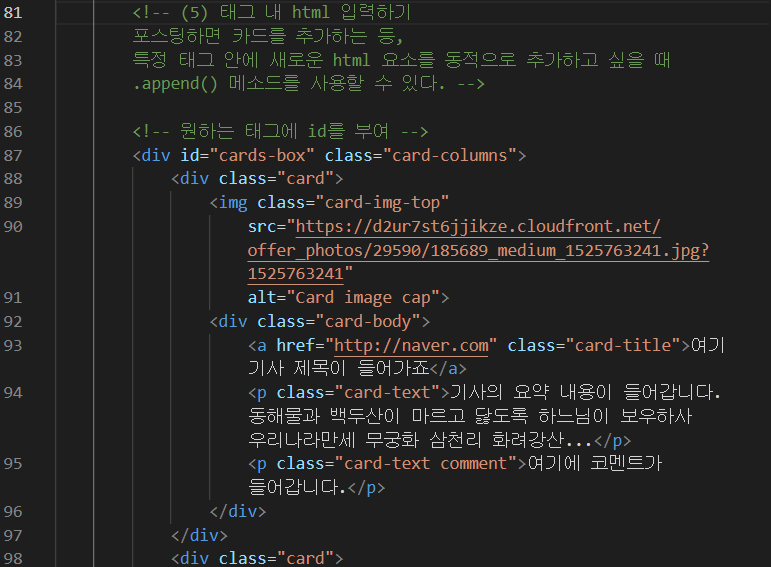 포스팅하면 카드를 추가하는 등, 특정 태그 안에 새로운 html 요소를 동적으로 추가하고 싶을 때는