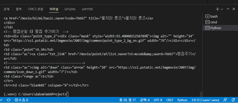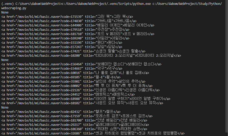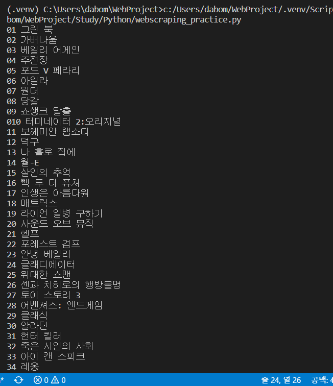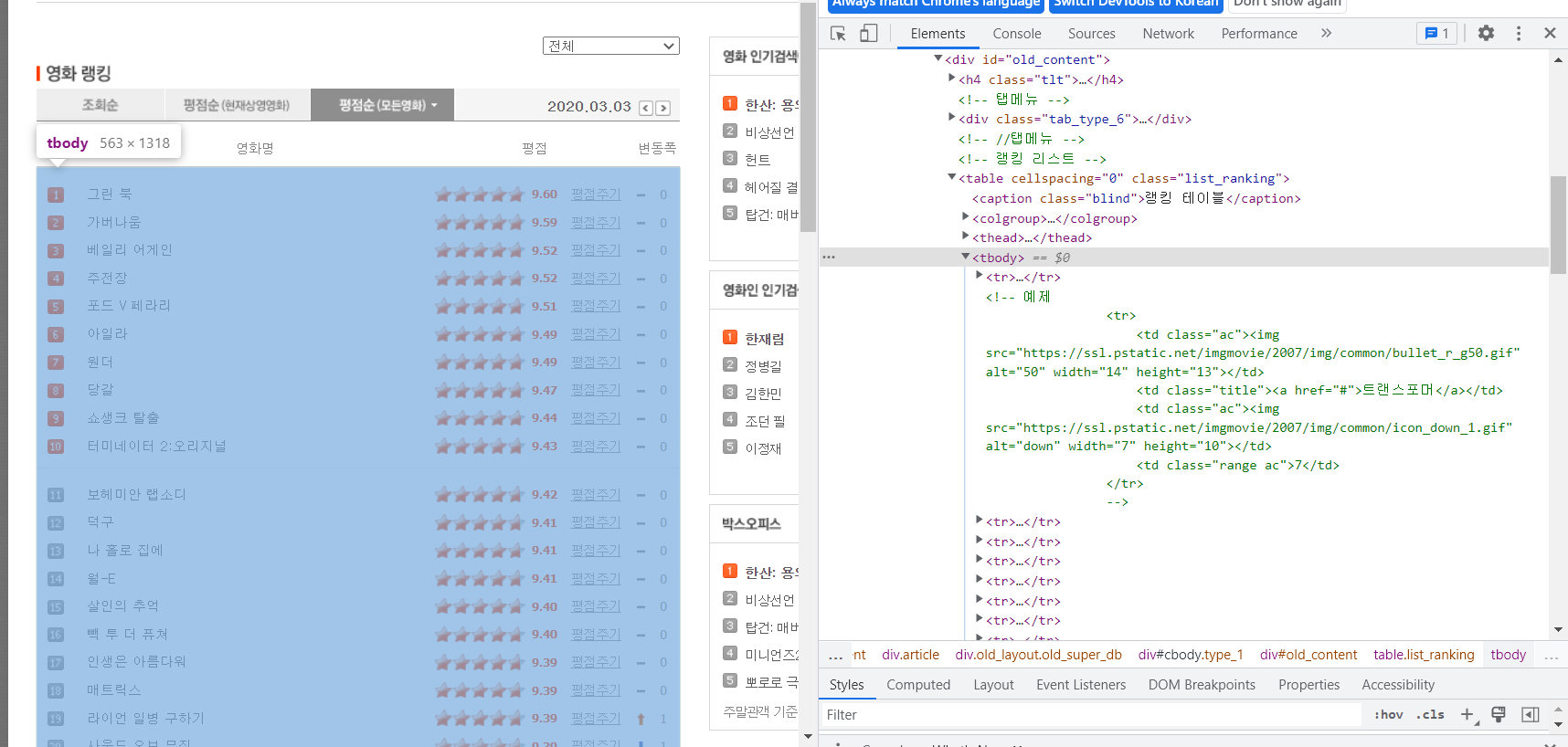 - 네이버 영화 순위 페이지에서 영화 제목들을 스크래핑해볼 것이다.