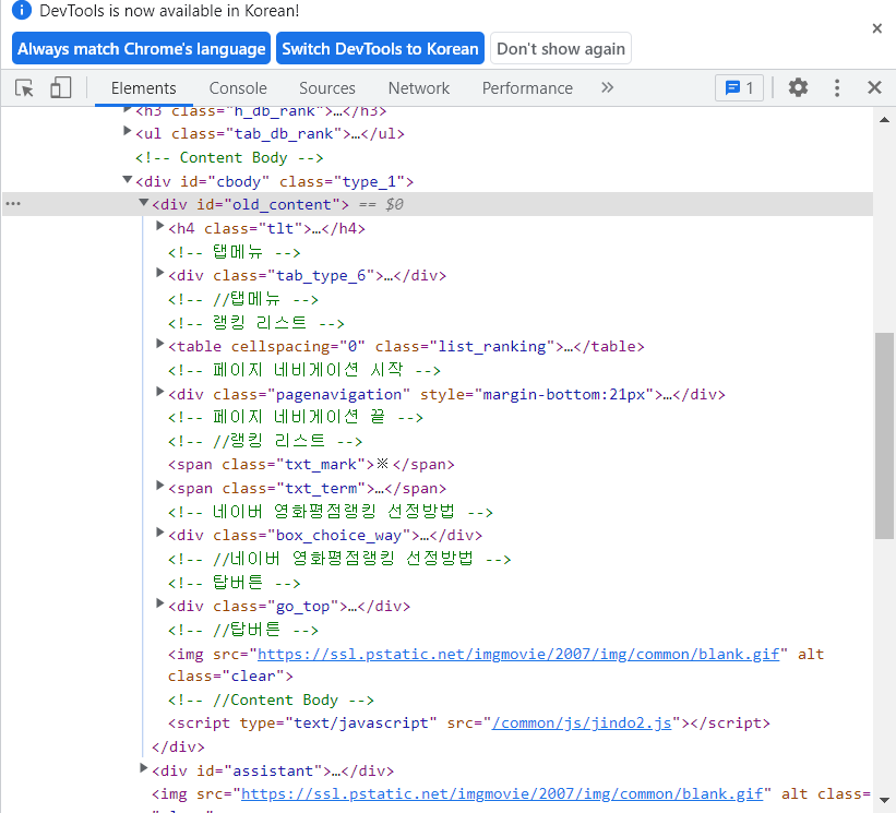 - 각 영화들이 old_content라는 id를 갖는 div 안에 table 안에 tbody 안에 tr 태그로 들어있다.