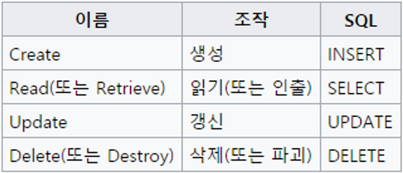 CRUD는 대부분의 컴퓨터 소프트웨어가 가지는 기본적인 데이터 처리 기능인 Create(생성), Read(읽기), Update(갱신), Delete(삭제)를 묶어서 일컫는 말이다.