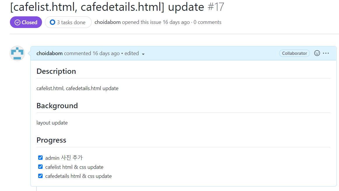 3. 수정 및 추가해야할 작업을 issue로 올린다.