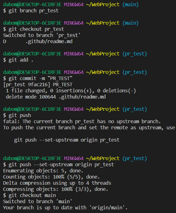 5) git commit -m "PR_test" (커밋)