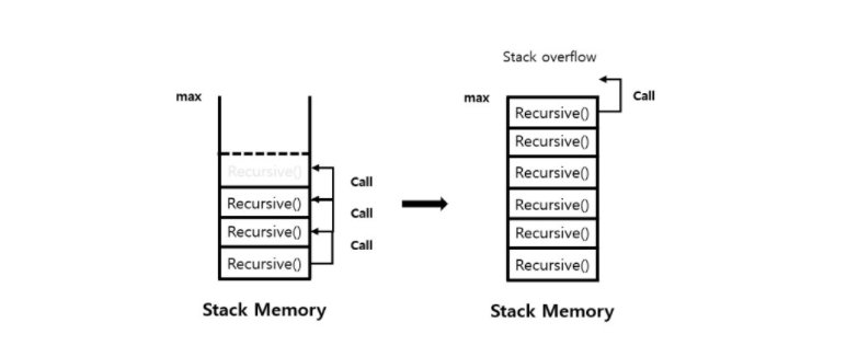 아래 그림과 같이 함수가 지속적으로 자신을 호출하게 되면 언젠가는 Stack 메모리 공간의 한계까지 올 것이며 이 한계를 넘어버리는 순간 문제가 발생한다. 그러므로 재귀함수를 사용할 때에는 반드시 탈출조건의 여부를 확인해야한다.