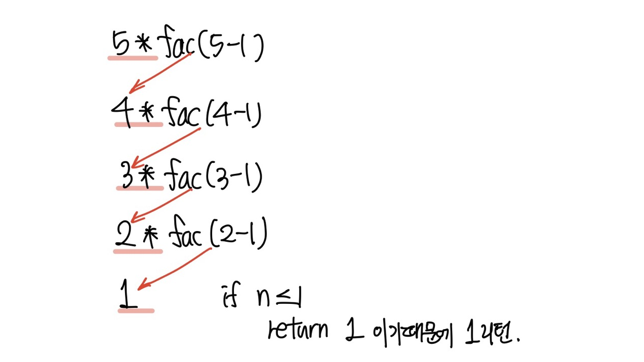 함수가 무한히 호출되어 StackOverflow가 발생하지 않기 위해선 탈출조건을 확인해야한다. 위 코드에서는 n <= 1 이면 0 혹은 1을 리턴하고 아닌 경우 n * factorial(n-1)을 리턴한다.