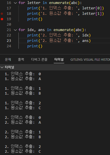 enumerate 함수를 이용하면 출력형식이 무조건 tuple 형식으로 나오기 때문에 인덱스 값만 빼오고 싶거나, 원소값만 빼오고 싶은 경우 위와 같은 두 방식을 이용하여 추출할 수 있다.