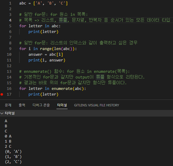# 기본적인 for문과 같지만 output이 튜플 형식으로 리턴된다.