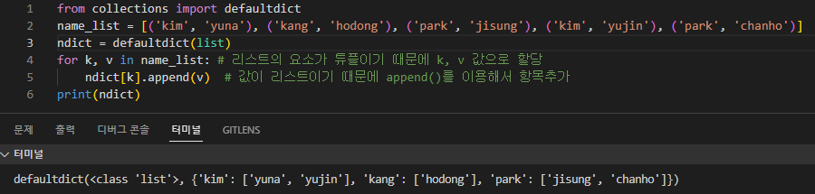 defaultdict()는 딕셔너리를 만드는 dict 클래스의 서브 클래스이다. defaultdict()는 인자로 주어진 객체의 기본값을 딕셔너리값의 초깃값으로 지정할 수 있다. 외부함수이기 때문에 import를 해야한다. (from collections import defaultdict)