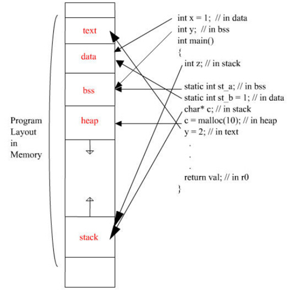 할당되는 메모리 공간은 크게 코드(Code), 데이터(Data), BSS, 힙(Heap), 스택(Stack)영역으로 나뉘어진다.