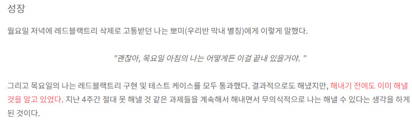 포인터의 의미를 조금씩 찾아나가자 포인터가 이런 느낌이구나...를 깨달았다. 사실 완전히 깨달았다고는 못하겠다. 그래도 어찌저찌 레드블랙 트리 수도코드를 쳐보면서 이 구조체를 사용하자고 포인터 변수를 사용하고 등등 .. 신기한 경험이었던 것 같다.