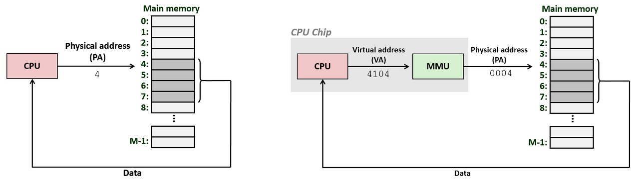 단순한 임베디드 마이크로컨트롤러와 같이 가상 메모리 기술을 사용하지 않는 시스템에서는 메모리 참조 방식이 아래 왼쪽 그림과 같다. 즉, CPU가 물리 주소를 메인 메모리에 바로 입력하여 메모리 참조를 진행하는 것이다. 반면 대부분의 현대 데스크탑, 서버, 노트북과 같이 가상 메모리 기술을 사용하는 시스템에서는 메모리 참조 방식이 아래 오른쪽 그림과 같다.