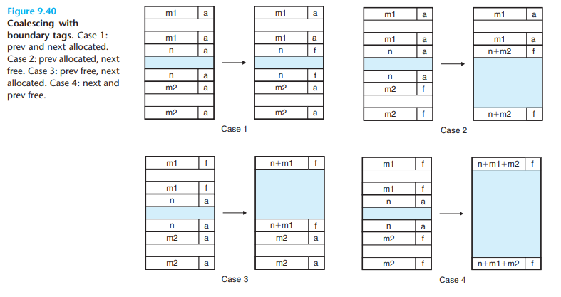 - 이런 경우를 막기 위해 연속적으로 존재하는 free block을 미리 합쳐놓는 작업을 할 수 있는데, 이를 coalescing이라고 한다.