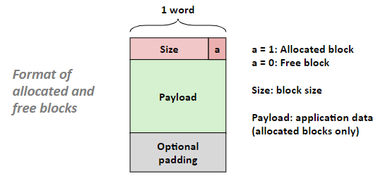 - 명시적 '할당기'(Explicit Allocator): 할당된 블럭을 명시적으로 해제(free)해줘야 하는 할당기 ex) C의 malloc, free