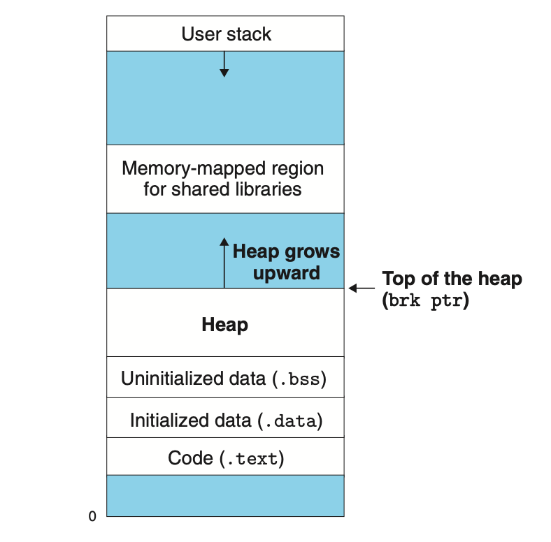 * 참고로 sbrk를 호출하면 brk 포인터를 위로 올리거나 낮춤으로써 heap memory를 증가시키거나 감소시킬 수 있다.