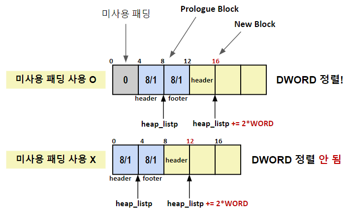 // => 남은 메모리가 최소한의 가용 블록을 만들 수 있는 4word(16byte)가 되느냐