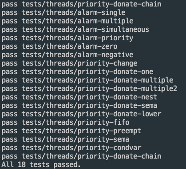 - PintOS는 여러 thread들이 Semaphore, Lock, Condition Variable를 얻기 위해 기다릴 경우 먼저 온 thread가 먼저 사용하는 FIFO 방식을 사용