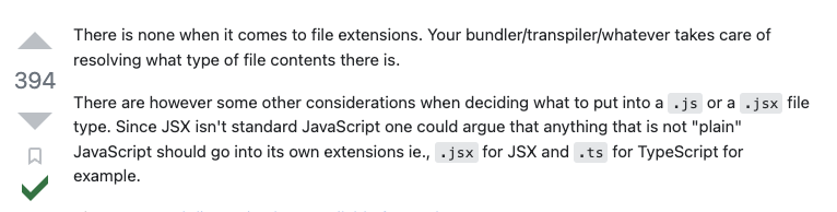 즉, 파일 내부에 표준 Javascript 문법만 사용됐다면 파일 확장자로 .js가 적절하다. 반면에 jsx나 Typescript처럼 파일 내부에 표준 Javascript 이외에 다른 코드가 있다면 해당 파일의 확장자는 .js가 아닌 다른 확장자로 지정한다고 한다.