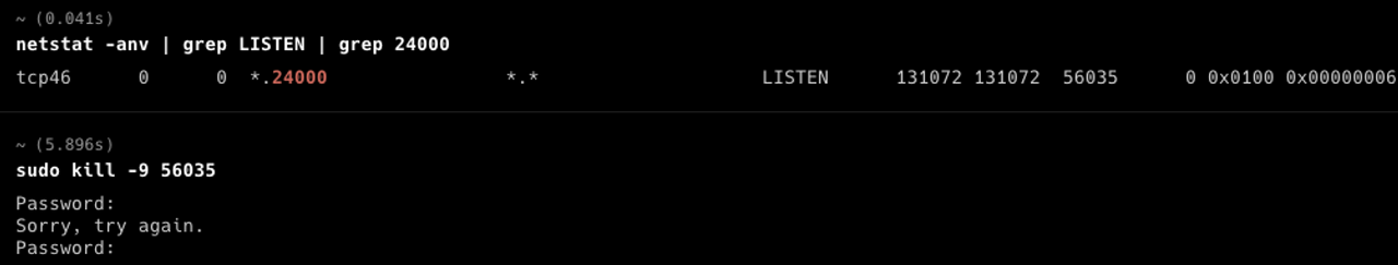netstat -anv | grep LISTEN | grep 24000 명령어를 잊지 말자.