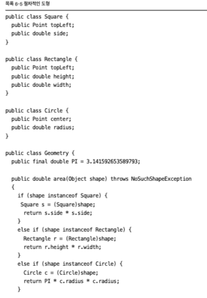 - 다시 말해, 객체 지향 코드에서 어려운 변경은 절차적인 코드에서 쉬우며, 절차적인 코드에서 어려운 변경은 객체 지향 코드에서 쉽다!