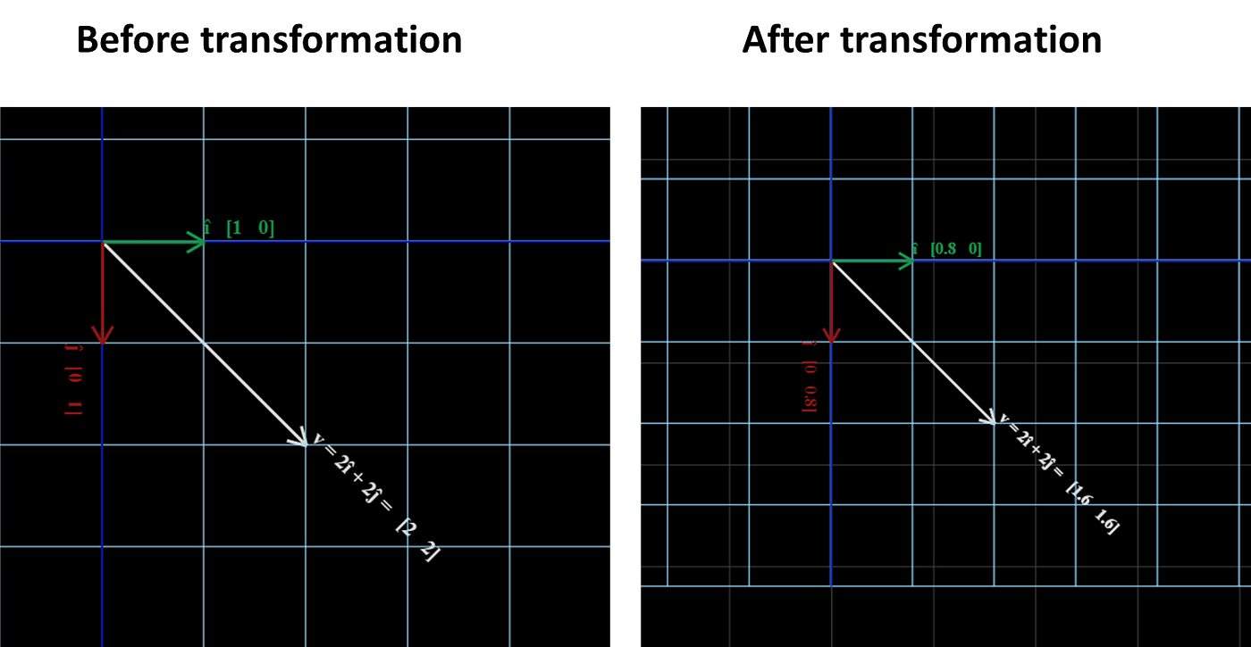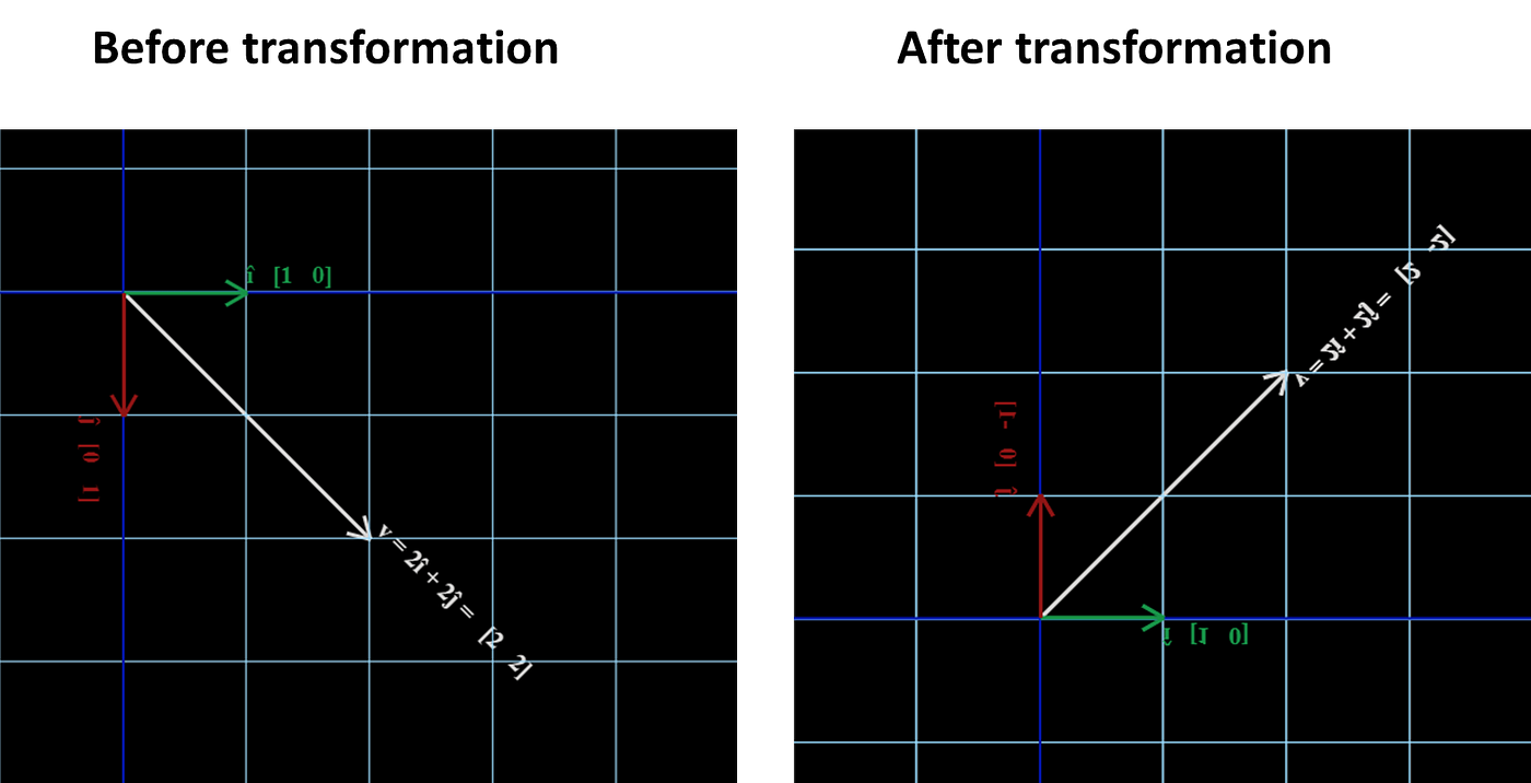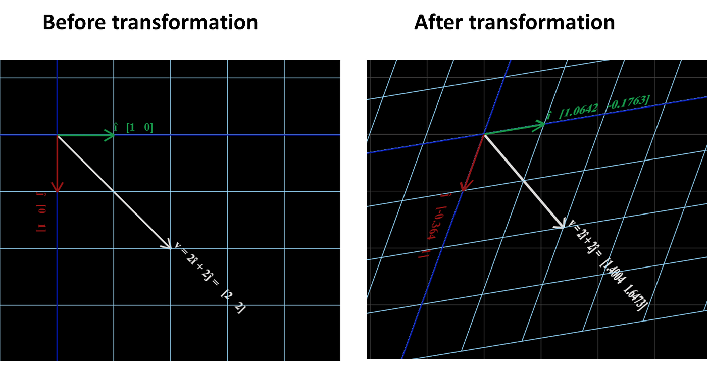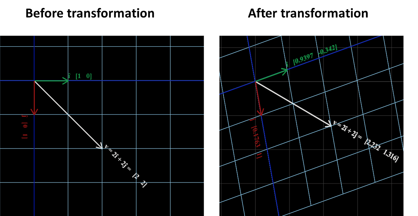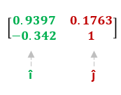 For example, the vector î before transformation was [1, 0] and after transformation is [0.9397, -0.342].