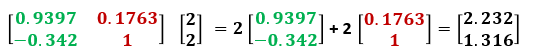 이 행렬의 첫 번째 열은 변환 후 벡터 î ([0.9397, -0.342])를 나타내고 행렬의 두 번째 열은 변환 후의 벡터 ĵ ([0.1763, 1])를 나타냅니다.