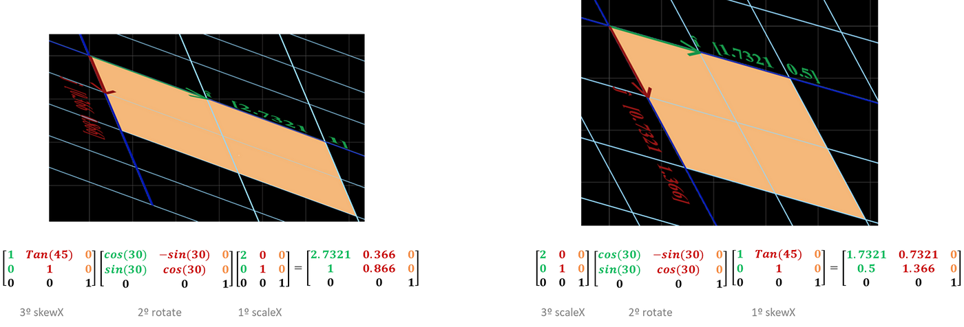 The more attentive reader may be wondering what happens if we apply skewX and skewY at the same time. We have to determine an order of operation, otherwise we will have a circular reference. In the case of the canvas (and fabric.js), first we apply the skewY and then the skewX: