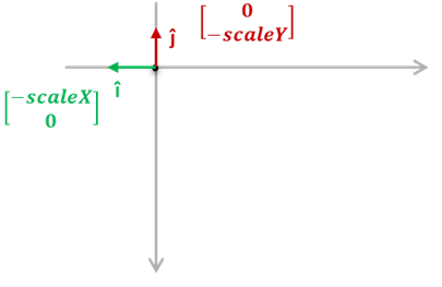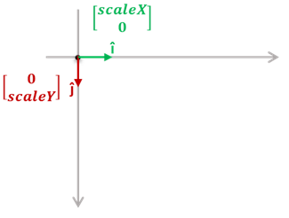 X축에 scale(배율)을 적용하고 Y축에 scale을 적용하면 변환 후의 단위 벡터 î 와 ĵ는 다음과 같습니다: