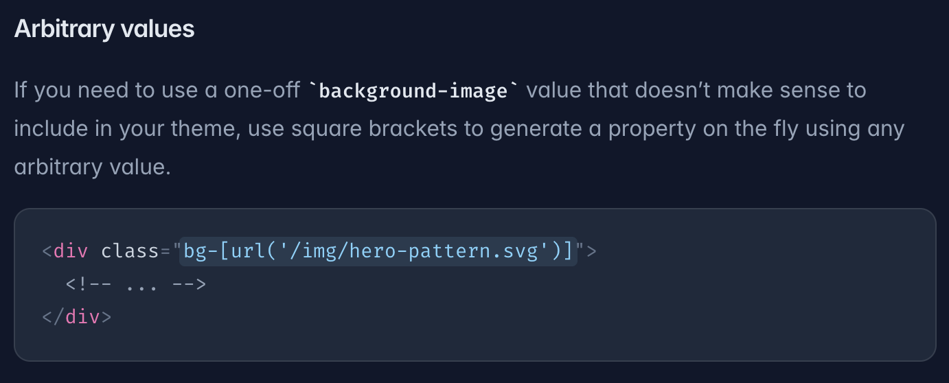 테마에 포함하기에는 적절하지 않은 일회성 배경 이미지 값을 사용해야 하는 경우 대괄호를 사용하여 임의의 값을 사용하여 즉석에서 속성을 생성할 수 있다.