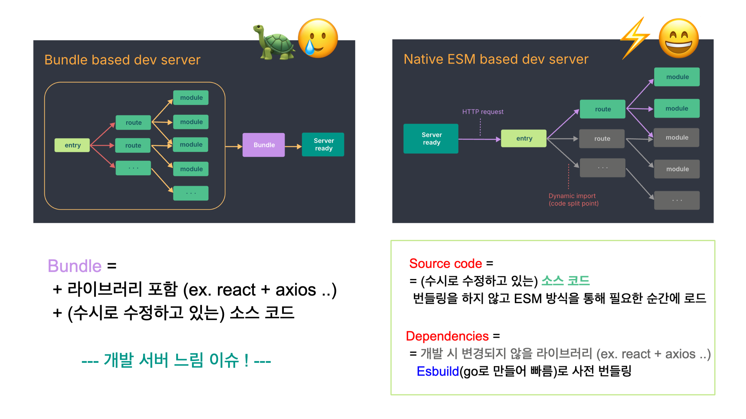 Vite는 애플리케이션의 모듈을 Dependencies와 Source code 두 가지 카테고리로 나눈다.