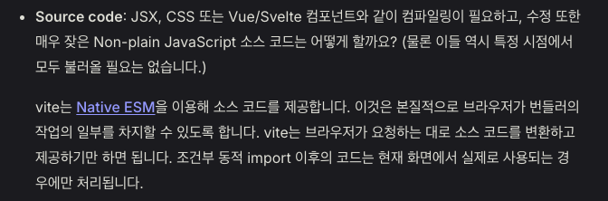 React 컴포넌트 파일(TSX), 스타일(CSS), Vue나 Svelte 같은 프레임워크의 컴포넌트 파일들이 'source code'로 분류될 수 있다. 이 소스 코드들은 개발 중에 수시로 수정되기 때문에, 매번 번들링해서 제공하는 것이 비효율적일 수도 있다.