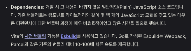그래서 Vite에서 말하는 사전 번들링 기능은 개발 시 변경되지 않을 JS 코드들을 Esbuild를 통해 사전 번들링한 후, 이후 개발 서버를 실행할 때는 사전 번들링된 정적인 코드만을 활용한다. esbuild는 Go로 작성된 초고속 번들러로, JavaScript 기반 번들러보다 최대 10-100배 빠르게 작업을 처리해 Vite의 개발 서버 초기 로딩을 크게 단축시킨다.