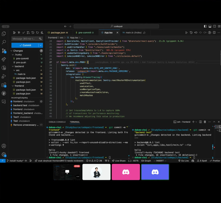 해당 시점은 Codepair를 모노레포로 전환하기 전이었기 때문에 frontend 디렉토리와 backend 디렉토리 각각의 package.json에서 husky가 실행되어야 했다. pre-commit 스크립트를 작성할 때 staged에 있는 파일이 frontend 디렉토리에 속하는지, backend 디렉토리에 속하는지 혹은 두 디렉토리 모두에서 속하는지에 따라 lint와 format이 작동되도록 yaml 파일을 수정했다.