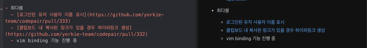 OSSCA 활동하면서 Yorkie는 매주 토요일마다 Weekly Sync를 하였고 이는 각각의 기여자들이 어떤 기여를 진행하고 있는지 공유하는 시간이다. Weekly Sync에서의 모든 기록은 Codepair에 문서로 작성되었다. 그렇다보니 매주 Codepair를 사용하였고, 과정에서 개선되었으면 하는 여러 부분들이 있었다. 아래 기록은 시간순으로 기존 이슈를 해결하거나 새로운 이슈를 등록하여 해결한 PR들이다.