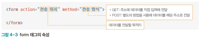 - <form> 태그는 method 속성의 방식으로 action 속성 장소에 데이터 전달