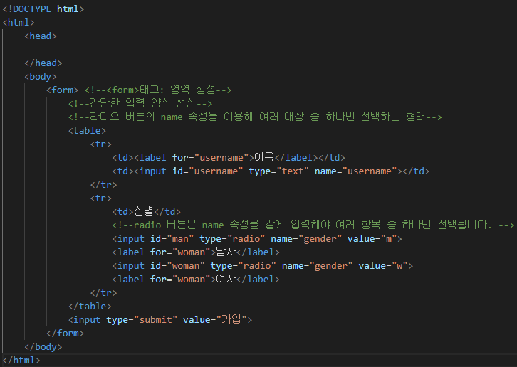 - 라디오 버튼의 name 속성을 이용해 여러 대상 중 하나만 선택하는 형태