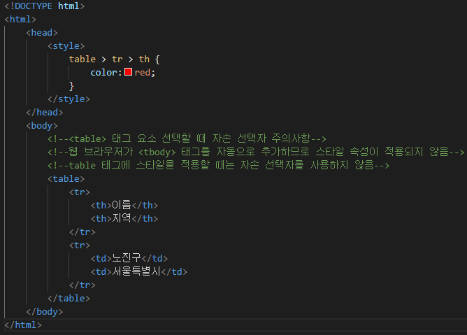 <table> 태그 요소 선택할 때 자손 선택자 주의사항