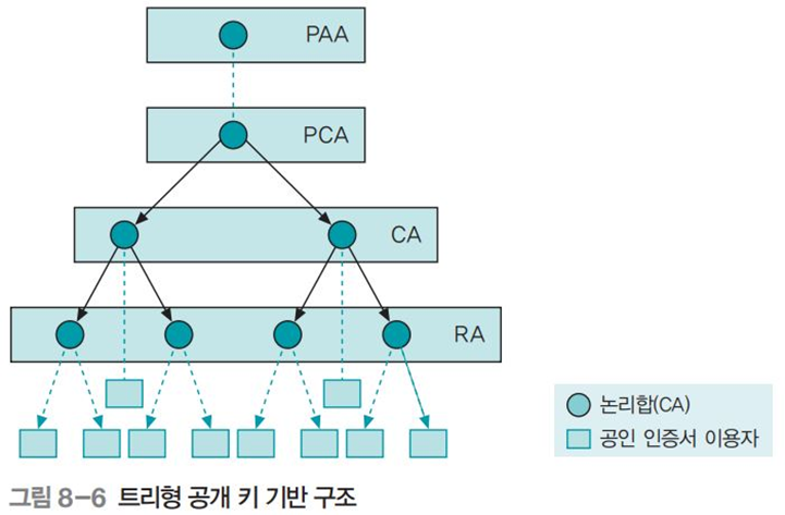 - PAA(Policy Approval Authorities): 정책 승인 기관으로 공인 인증서에 대한 정책을 결정하고 하위 기관의 정책을 승인한다. 우리나라는 과학기술정보통신부가 이런 일을 담당한다.