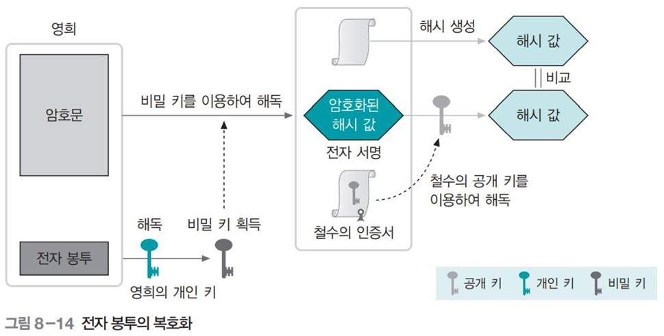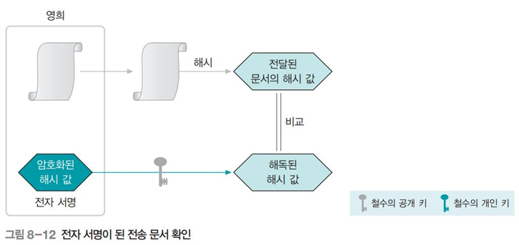 -> 영희는 철수의 공개 키를 이용하여 암호화된 해시 값을 복호화하고 편지를 해시한 값과 비교한다.