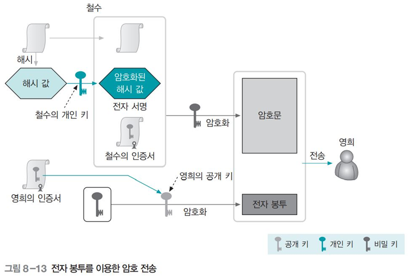 최종적으로 철수는 비밀 키로 암호화한 결과와 비밀 키가 암호화된 전자봉투를 영희에게 보낸다.