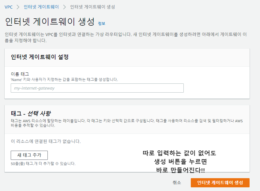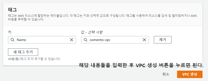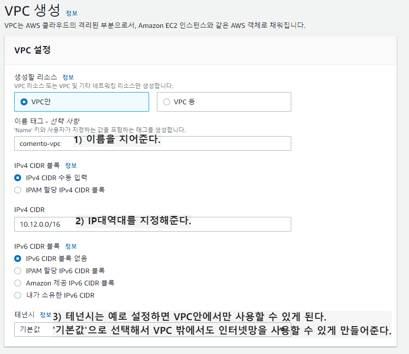 이름 태그에 이름을 지어주고, IPv4 CIDR 블록에서 IP 대역대를 지정해준다.