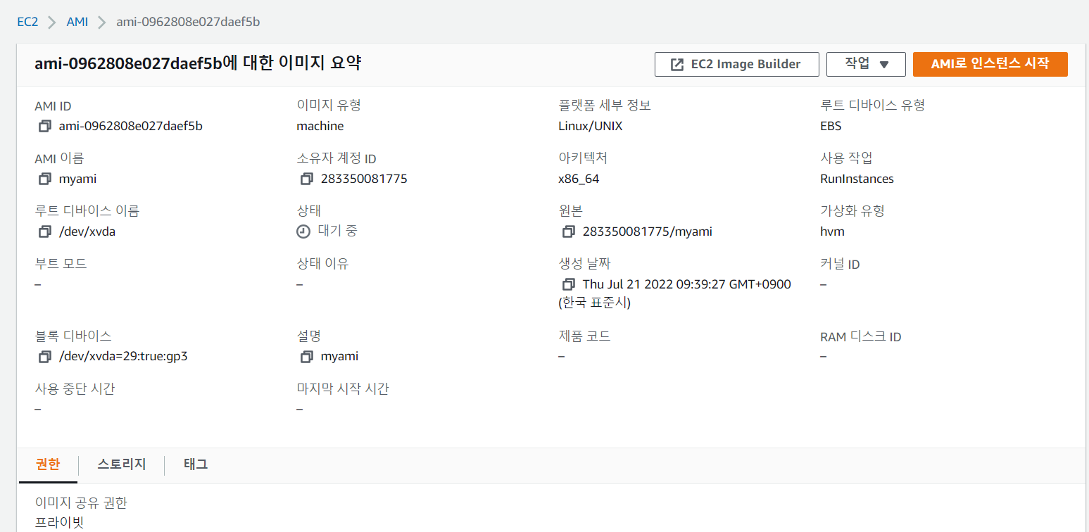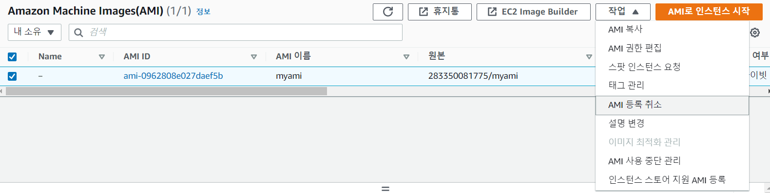AMI 메뉴에서 작업>시작하기를 누르면 EC2 생성 화면과 동일하게 나오고 설정하면 된다.