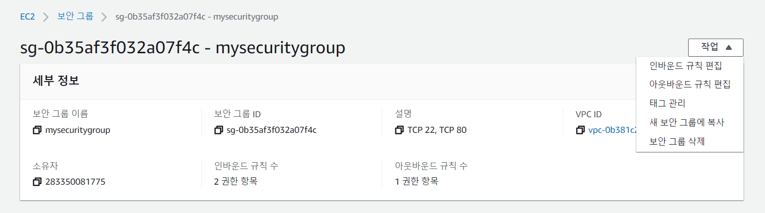 * 만약 컴퓨터에 연결된 네트워크 장비(와이파이 등) 변경되어, 컴퓨터의 IP가 바뀌면 이 정보도 변경되어야 한다. 추후 EC2에 연결된 보안그룹을 수정할 수 있다. TCP 22와 TCP 80 모두 IP를 수정해줘야 잘 되었다.