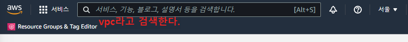 먼저 콘솔에 접속해서 상단 중앙에 있는 검색창에 vpc라고 검색한다.