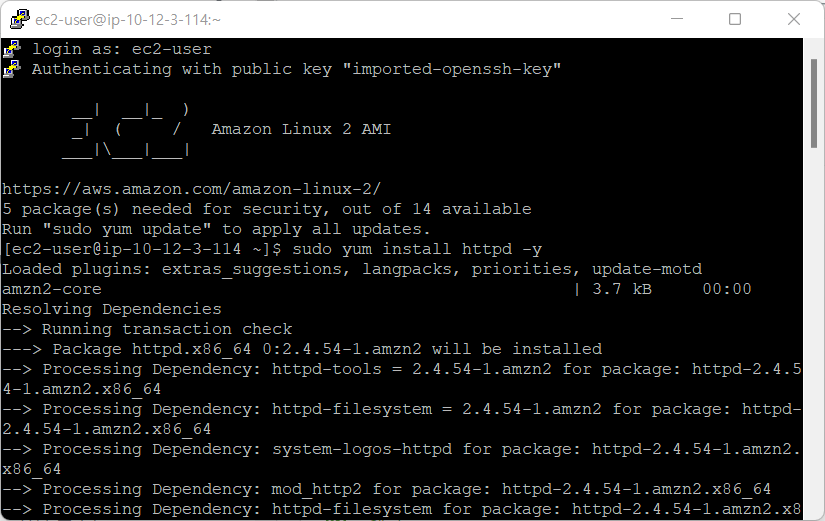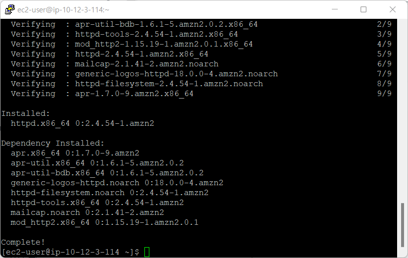 를 입력하여 httpd Apache 웹서버를 설치한다.