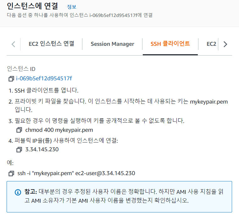 ec2-user 를 입력해주면 로그인이 가능하다.