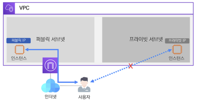 - 퍼블릭 서브넷은 외부와의 자유로운 통신이 가능한, 외부 인터넷 구간과 직접적으로 통신을 할 수 있는 공공 네트워크이다.