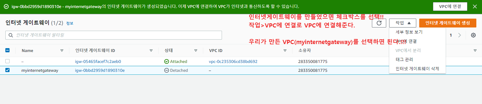 2. 인터넷게이트웨어를 만들고 라우팅 테이블에서 VPC와 연결시킨다.