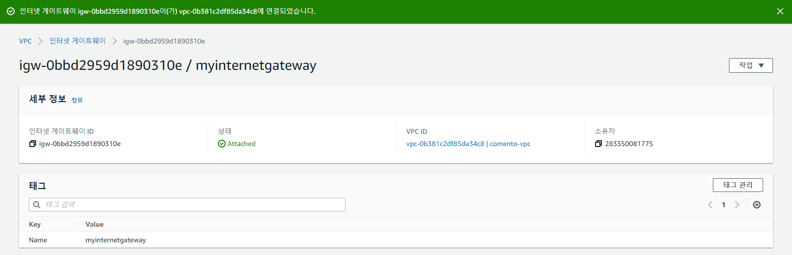 인터넷게이트웨이를 생성한 후 연결시켜서 서브넷이 인터넷망에 접속할 수 있도록 만든다.